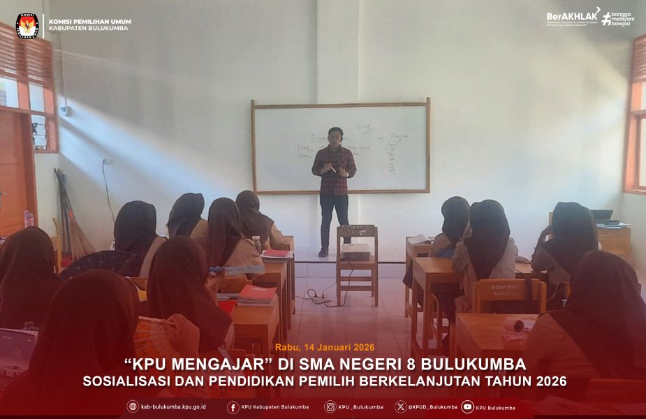 KPU Kabupaten Bulukumba melaksanakan Sosialisasi dan Pendidikan Pemilih Berkelanjutan dalam bentuk "KPU Mengajar" yang merupakan program terintegrasi 24 Kabupaten/Kota oleh KPU Provinsi Sulawesi Selatan,Rabu (14/1/2026). Sekolah kedua yang didatangi adalah SMA Negeri 8 Bulukumba yang terletak di Jalan KH. Mukhtar Lutfi No. 32, Kelurahan Caile, Kecamatan Ujung Bulu, Kabupaten Bulukumba. Hadir sebagai pemateri pada kegiatan tersebut Anggota KPU Kabupaten Bulukumba (Divisi Teknis Penyelenggaraan) Syamsul. Melalui kegiatan ini, KPU Kabupaten Bulukumba berharap siswa-siswi dapat menjadi pemilih muda yang aktif, kritis, dan berintegritas, serta turut berperan dalam menjaga kualitas demokrasi. ....