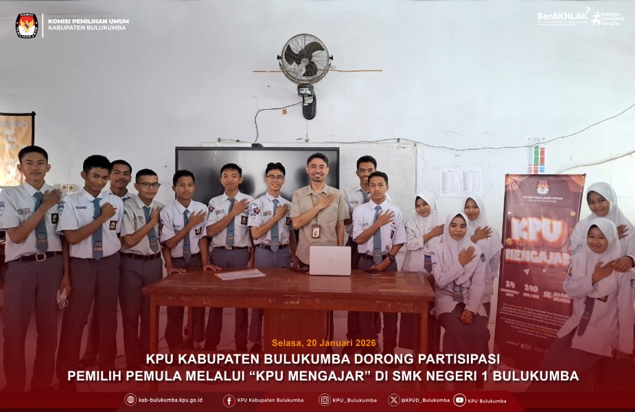 Komisi Pemilihan Umum (KPU) Kabupaten Bulukumba melaksanakan Sosialisasi Pendidikan Pemilih Berkelanjutan dengan program "KPU mengajar" dengan segmen pemilih pemula, Selasa (20/1/2026). Sekolah ketiga yang didatangi adalah SMK Negeri 1 Bulukumba yang terletak di Jl. Teratai Nomor 24, Kelurahan Caile, Kecamatan Ujung Bulu, Kabupaten Bulukumba. KPU Mengajar adalah program KPU Provinsi Sulawesi Selatan yang merupakan kegiatan Sosialisasi dan Pendidikan Pemilih Berkelanjutan yang terintegrasi di 24 Kabupaten/Kota dengan menyasar pemilih pemula. Hadir sebagai pemateri pada kegiatan tersebut Anggota KPU Kabupaten Bulukumba (Divisi Perencanaan, Data dan Informasi) Rakhmat Fajar. Kegiatan ini bertujuan untuk mengedukasi calon pemilih pemula agar menjadi pemilih yang cerdas, kritis, dan berintegritas, dalam proses demokrasi di Indonesia. Demokrasi bukan hanya soal mencoblos saat pemilu, tapi juga cara berpikir dan bersikap untuk menghargai perbedaan. ....