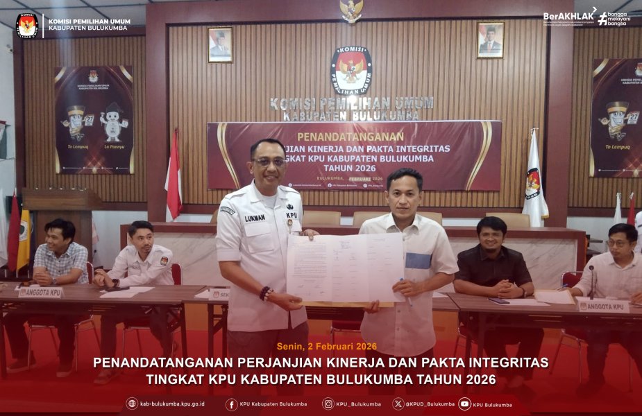 Komisi Pemilihan Umum (KPU) Kabupaten Bulukumba melaksanakan kegiatan Penandatanganan Perjanjian Kinerja dan Pakta Integritas Tahun 2026 yang diikuti oleh seluruh jajaran Komisioner serta seluruh pegawai Sekretariat KPU Kabupaten Bulukumba, Senin (2/2/2026). Kegiatan ini merupakan bentuk komitmen bersama dalam mewujudkan tata kelola organisasi yang profesional, berintegritas, dan akuntabel, serta sebagai langkah awal pelaksanaan program dan kegiatan KPU Kabupaten Bulukumba pada Tahun Anggaran 2026. Penandatanganan Perjanjian Kinerja dan Pakta Integritas tersebut menegaskan komitmen seluruh jajaran KPU Kabupaten Bulukumba untuk melaksanakan tugas dan fungsi sesuai dengan peraturan perundang-undangan, menjunjung tinggi nilai-nilai integritas, transparansi, serta akuntabilitas dalam setiap tahapan penyelenggaraan pemilu dan pemilihan. ....