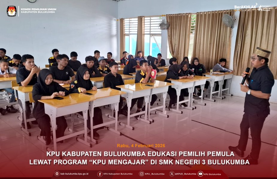 Komisi Pemilihan Umum (KPU) Kabupaten Bulukumba terus melakukan penguatan pendidikan demokrasi di daerah melalui berbagai program edukatif. Salah satunya adalah program “KPU Mengajar” yang menyasar siswa Sekolah Menengah Atas sebagai pemilih pemula. Rabu (04/02/2026) Program KPU Mengajar dilaksanakan di SMK Negeri 3 Bulukumba yang berlokasi di Jl. Poros Bira Bulukumba KM. 6, Desa Salemba, Kecamatan Ujung Loe, Kabupaten Bulukumba. Kegiatan yang berlangsung pada Rabu (04/02/2026) ini dihadiri langsung oleh Anggota KPU Kabupaten Bulukumba (Divisi Hukum dan Pengawasan) Syamsul sebagai pemateri utama serta melibatkan para guru masing-masing atas nama Yusnandar, ST (Wakasek Sarana dan Prasarana) dan Muhammad Iqbal Hs,S.Pd.,MM (Wakasek Kesiswaan) sebagai pendamping siswa. Dalam pemaparannya, ia menekankan pentingnya kesadaran politik bagi siswa yang akan segera menggunakan hak pilihnya untuk pertama kali. Melalui program ini, KPU Kabupaten Bulukumba berharap dapat meningkatkan literasi politik pelajar dan membentuk pemilih pemula yang cerdas, kritis, serta meningkatkan pemahaman pelajar mengenai demokrasi dan kepemiluan sejak dini. ....