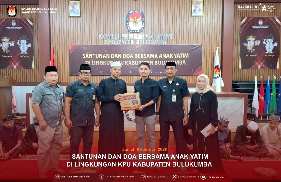 Komisi Pemilihan Umum (KPU) Kabupaten Bulukumba melaksanakan kegiatan pemberian santunan dan doa bersama anak yatim, sebagai bentuk kepedulian sosial sekaligus refleksi nilai kemanusiaan di lingkungan kerja. Kegiatan berlangsung di Aula KPU Kabupaten Bulukumba, Jumat (06/02/2026). Kegiatan ini merupakan instruksi KPU RI yang dilaksanakan serentak, sekaligus menjadi wujud nyata kepedulian KPU Kabupaten Bulukumba kepada sesama. Acara dikemas secara khidmat dengan doa bersama serta penyerahan santunan secara simbolis kepada perwakilan anak yatim. Hadir dalam kegiatan tersebut Anggota KPU Kabupaten Bulukumba Divisi Perencanaan, Data dan Informasi Rakhmat Fajar, Sekretaris KPU Kabupaten Bulukumba Andi Lukman Mujaya, jajaran sekretariat, serta seluruh keluarga besar KPU Kabupaten Bulukumba. Anggota KPU Kabupaten Bulukumba Rakhmat Fajar mengatakan kegiatan ini menjadi sarana membangun kehangatan dan keakraban di lingkungan kerja, sekaligus wujud kepedulian KPU terhadap masyarakat sekitar. Acara berlangsung dengan penuh kekhidmatan. Doa bersama dipanjatkan sebagai ikhtiar memohon keberkahan atas tugas-tugas kelembagaan, sekaligus mendoakan almarhum Bagaskara Langit Kresna Putra Sutrisno, putra dari Sekretaris Jenderal KPU RI. Kehadiran anak-anak yatim membawa suasana hangat dan menyentuh, menjadikan kegiatan ini sebagai pengingat bahwa kerja kelembagaan juga membutuhkan ruang untuk berbagi serta menanamkan nilai-nilai kebaikan. Melalui kegiatan ini, KPU Kabupaten Bulukumba berharap semangat berbagi dan kepedulian sosial terus tumbuh, tidak hanya dalam momentum tertentu, tetapi menjadi bagian dari budaya kerja sehari-hari. ....