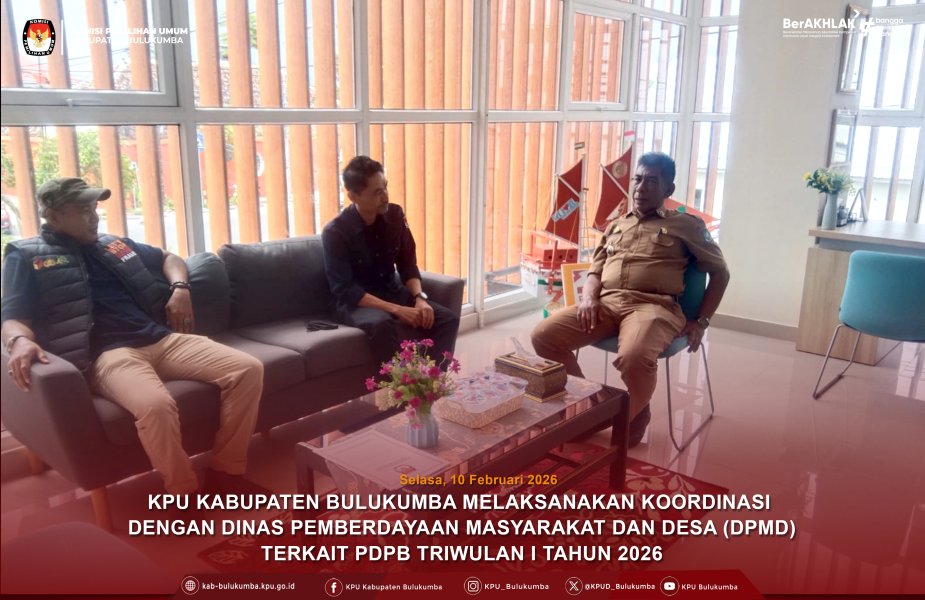 Komisi Pemilihan Umum (KPU) Kabupaten Bulukumba bersama Bawaslu Kabupaten Bulukumba melakukan koordinasi dengan Dinas Pemberdayaan Masyarakat dan Desa (DPMD) guna mengoptimalkan Pemutakhiran Data Pemilih Berkelanjutan (PDPB), Selasa (10/02/2026). Tujuan Koordinasi untuk membangun sinergi untuk menjaga akurasi dan validitas daftar pemilih dengan memperbarui data penduduk secara berkala, seperti mencatat pemilih baru, pemilih yang telah meninggal dunia, atau perubahan status kependudukan. Upaya ini mengacu pada Peraturan KPU Nomor 1 Tahun 2025 yang mewajibkan KPU untuk terus memperbarui data pemilih meskipun sedang tidak berada dalam tahapan pemilu atau pilkada ....